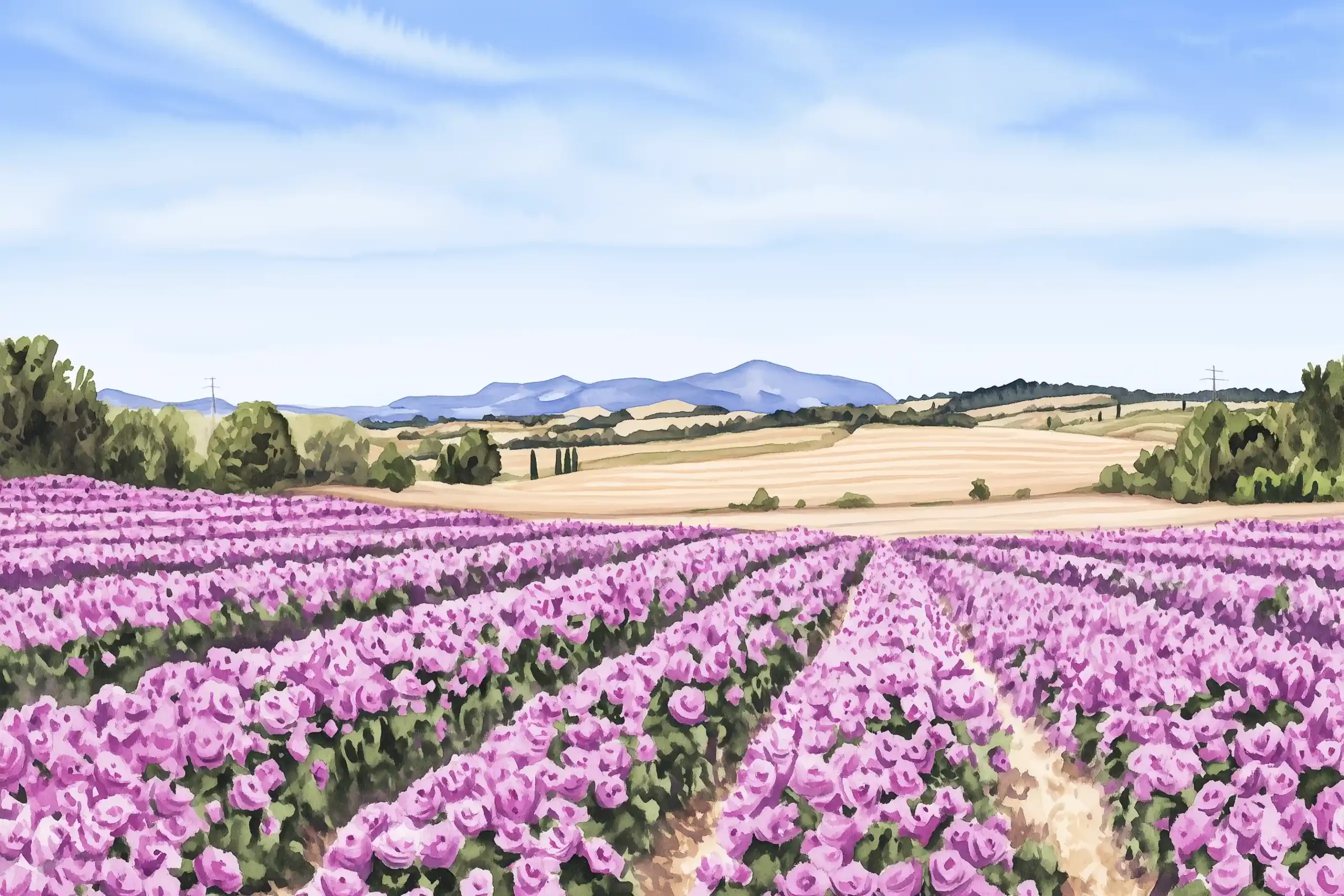 Stell dir vor, du gehst durch ein weites Rosengartenfeld, in dem die Blüten in allen Farben erstrahlen und der Duft von frisch erblühenden Rosen in der Luft schwebt. Die sanfte Brise trägt den süßen, betörenden Rosenduft weit über das Feld.