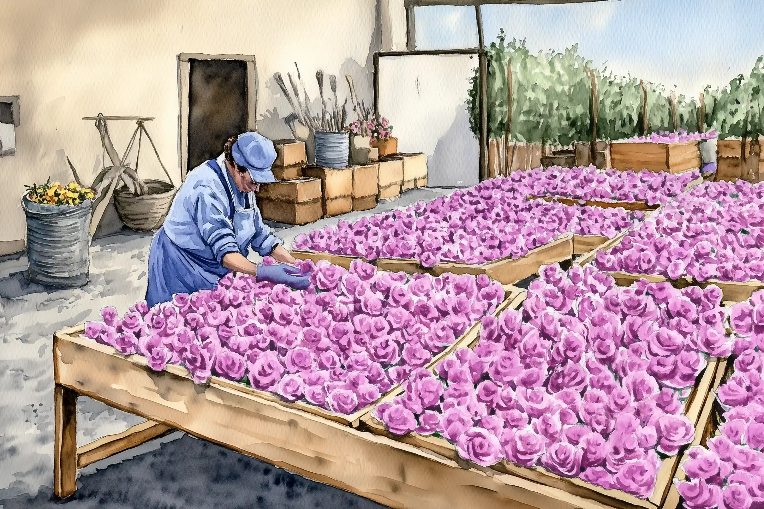 Nach der Ernte werden die Rosenblüten auf Tischen ausgebreitet, sorgfältig sortiert und vorbereitet. Nur die besten Blüten kommen in die Verarbeitung, damit der natürliche, reine Rosenduft in seiner reinsten Form erhalten bleibt.